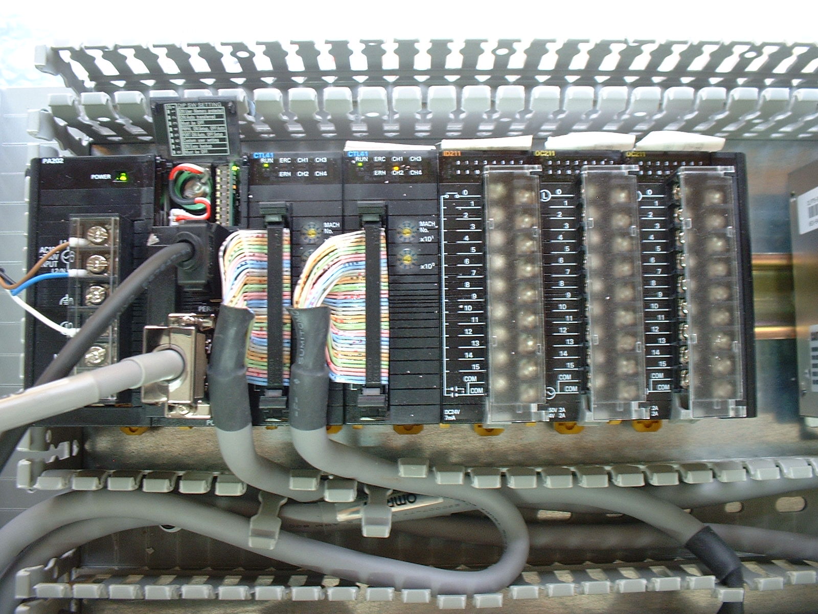 - Utilisation d'un automate OMRON type CJ, ici en cours de montage, pour la gestion des axes.